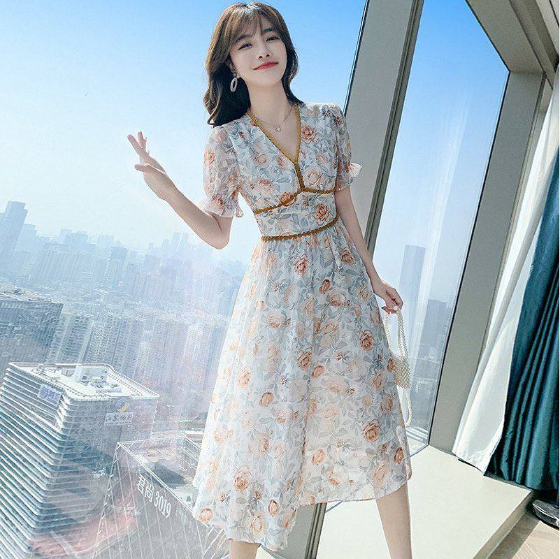 气质法式坚果子女服饰领桔梗2021中长碎花裙夏季新款V雪纺连衣裙热门设计联盟服务商