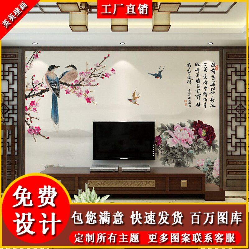 新中式花景电视背4墙装饰壁纸卧室客厅F墙纸8d壁画鸟d无缝影视墙热门设计联盟服务商