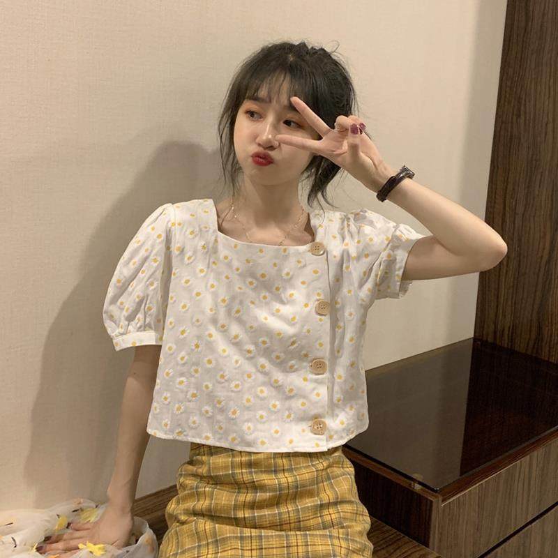 2020年新款韩版百搭锁骨设计感短袖衬衫女法式方领泡泡袖短款上衣热门设计联盟服务商