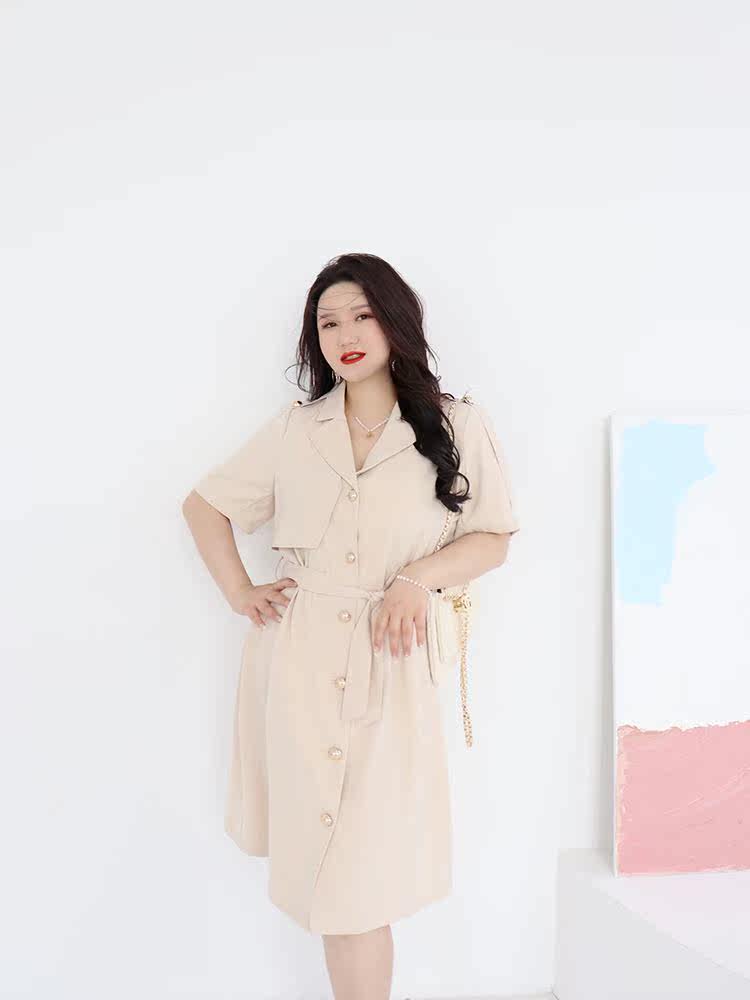 胖多家2021夏季新款大码显瘦设计感米白色金扣连衣裙百中裙热门设计联盟服务商