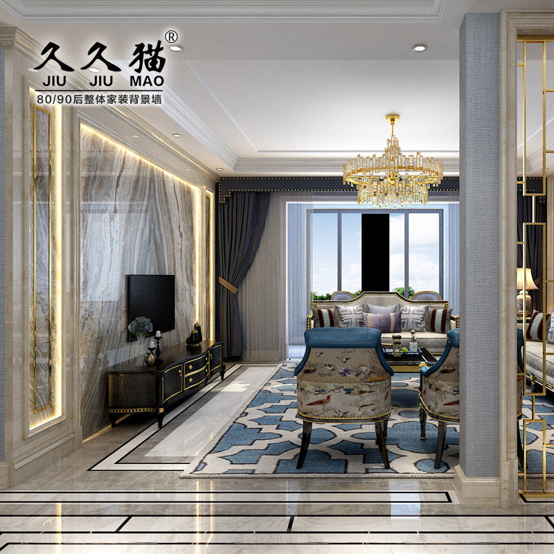 欧式新古典微晶石电视瓷砖背景墙客厅美式石纹轻奢护墙板影视墙。热门设计联盟服务商