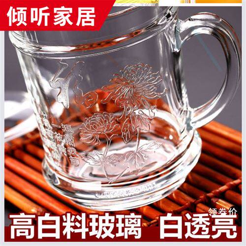 家用加厚耐热梅兰竹菊刻花玻量杯办公泡茶杯大杯璃U带盖带把水容热门设计联盟服务商