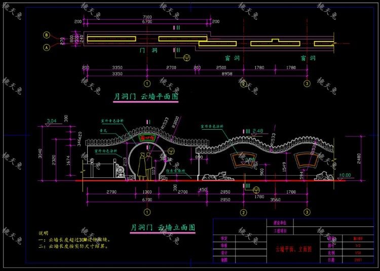 园林景观云墙、月洞门施工图CAD图纸月亮门仿古中式围墙