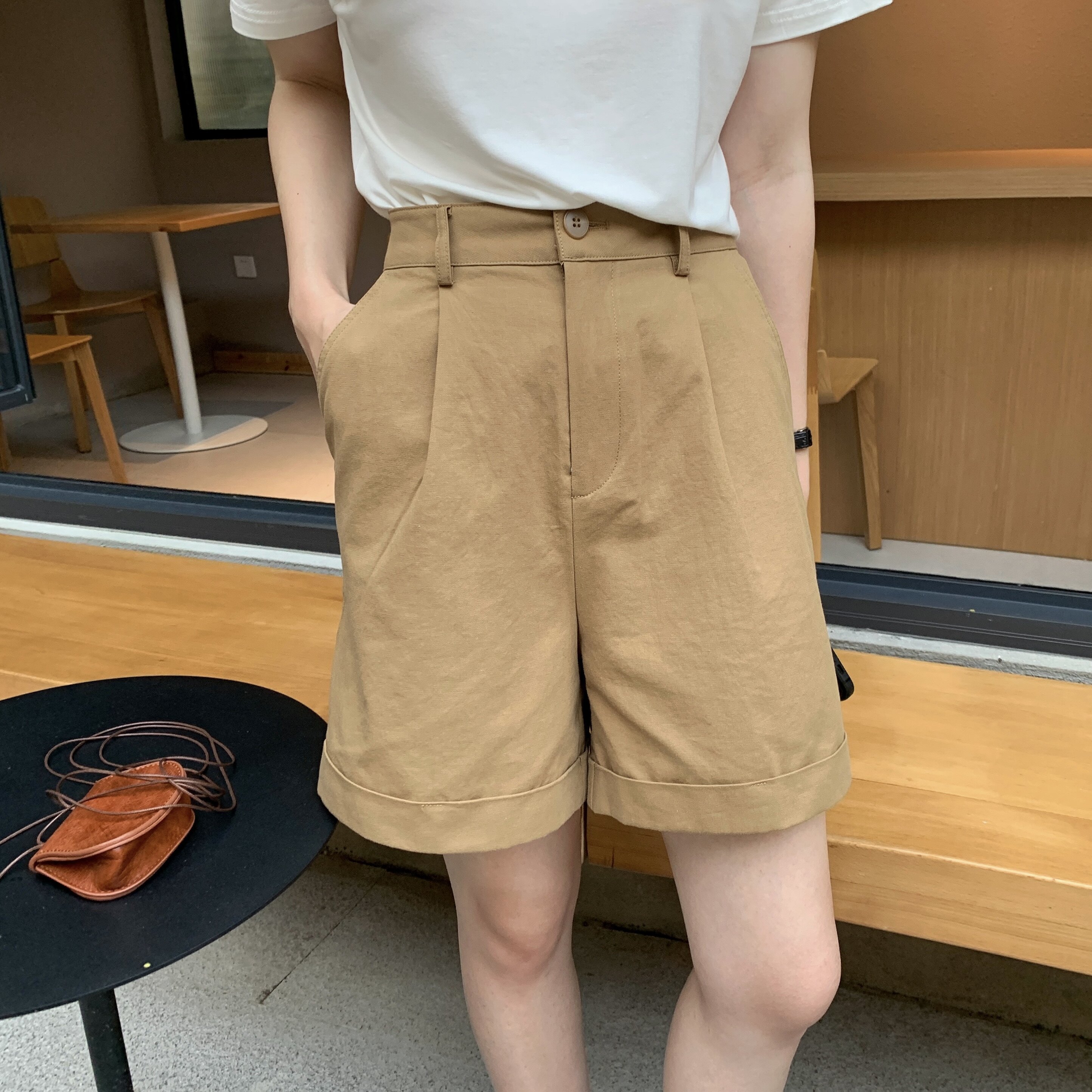 MEIWAKI 夏纯棉卡其休闲短裤女宽松显瘦卷边A字高腰阔腿工装裤子热门设计联盟服务商