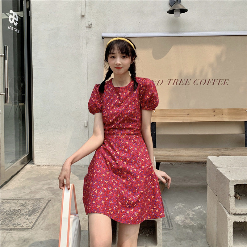 2021新款夏季约会收腰显瘦字裙子漫画少女红色碎花连衣裙热门设计联盟服务商